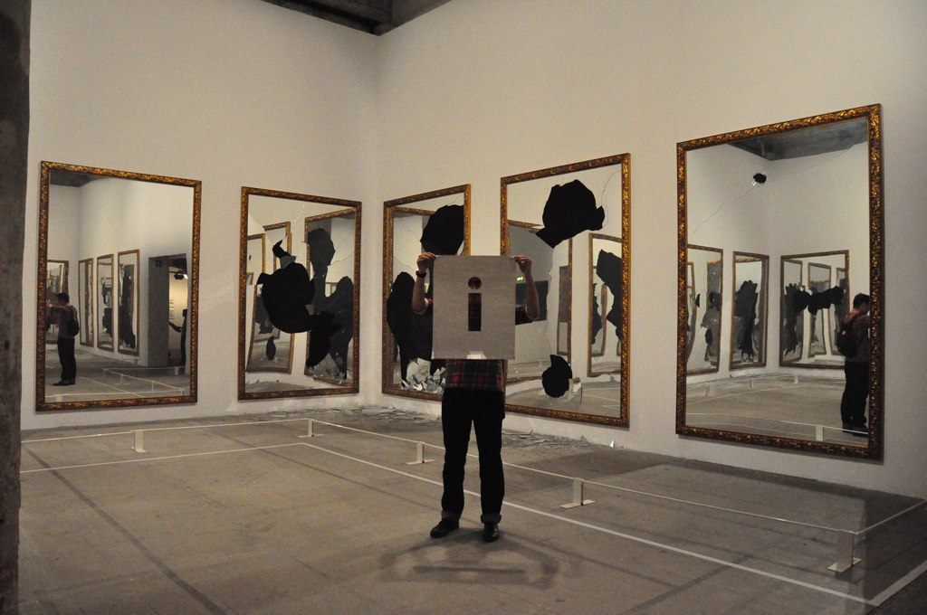 In the vibrant landscape of the Venice Biennale in the years 2009 (Fare Mondi) and 2013 (The Encyclopedic Palace), this transformative principle was put into action. An exploratory device made of venetian marbled paper (Carta Marmorizzata) with a cut-out of the letter "i" functioned as an interaction key, stealthily intervening beneath a selection of the Biennale's artworks. It was a quiet act of creative dialogue and response – an echo and a little ripple in that ocean of artistic expression.
